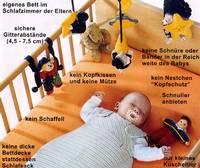 - Verwenden Sie keine Kopfkissen. Achten Sie darauf, dass keine Bettumrandung und keine Zudecke verrutschen kann, damit Baby's Kopf nicht zugedeckt werden kann.